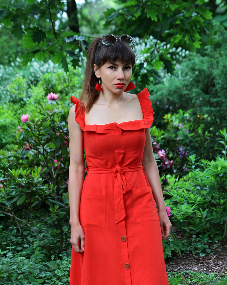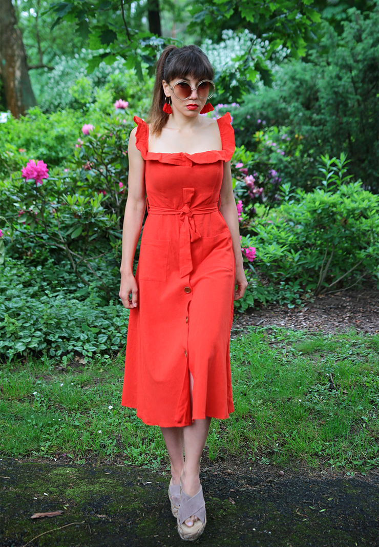 PL: Podczas upałów proste zestawy, z naturalnych, przewiewnych materiałów sprawdzają się najlepiej. Dlatego właśnie od kilku tygodni poszukiwałam bawełnianej lub lnianej, podkreślającej talię sukienki w moim ulubionym kolorze. Jak się okazało, nie było to wcale takie łatwe, bo wszędzie rządzi poliester i workowate fasony. Ostatecznie znalazłam bawełnianą sukienkę o całkiem ciekawym kroju, a podczas długiego weekendu pogoda wreszcie pozwoliła na noszenie typowo letnich ubrań.