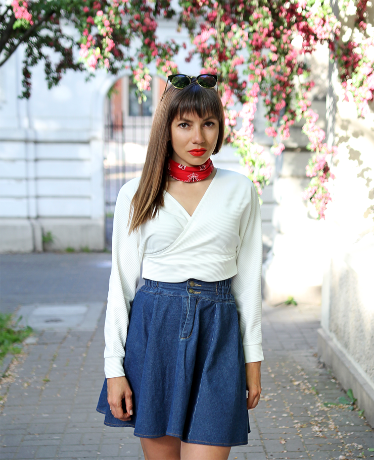 PL: Jak widzicie ostatnio przeważają u mnie bardzo proste, wygodne zestawy, urozmaicone dodatkami. Podobnie jest i tym razem. Denim i biel to już klasyka, którą wyjątkowo często zdarza mi się nosić. Kopertowy top od Femmeluxefinery w połączeniu z moją ulubioną dżinsową spódnicą z koła, trochę czerwieni w postaci apaszki, czółenek oraz szminki i voilà.
